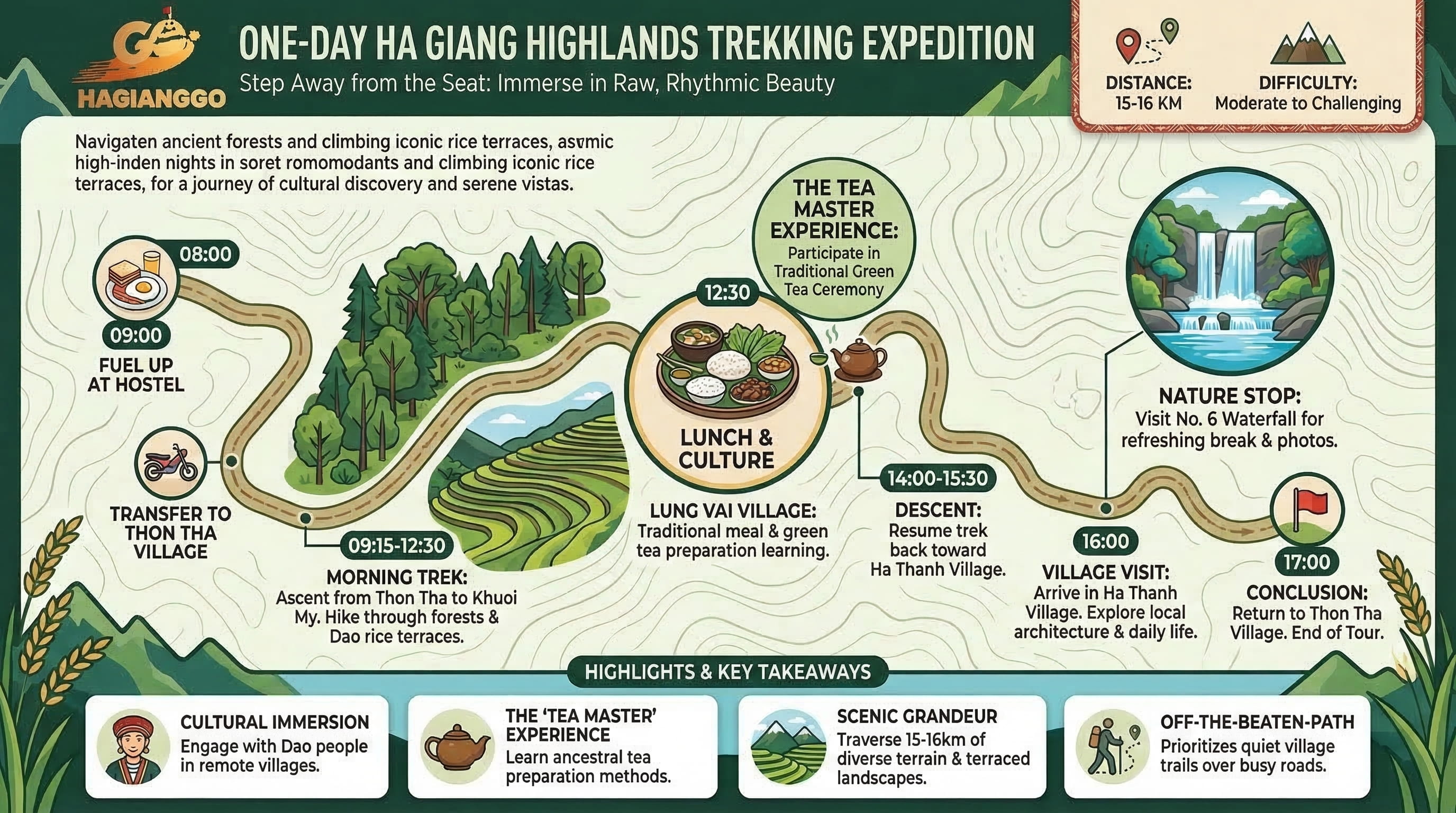 Step away from the motorbike seat and immerse yourself in the raw, rhythmic beauty of the northern highlands. This intensive one-day trekking expedition takes you deep into the heart of the Dao ethnic communities surrounding Ha Giang. Designed for those who crave an authentic connection with nature, you will navigate through ancient forests and climb the iconic rice terraces that define this "frontier" landscape. It is a journey of physical challenge, cultural discovery, and serene mountain vistas.